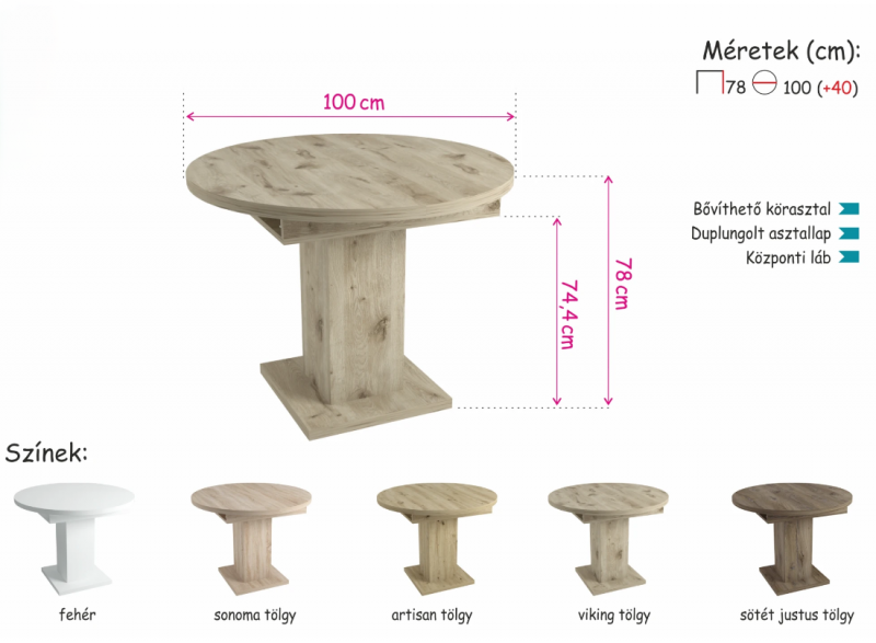 Az asztalunk 100 cm-es méretben, bővíthető vendéglappal kapható. 5 színben vásárolható meg: fehér, sonoma tölgy, artisan tölgy, viking tölgy és sötét justus tölgy.