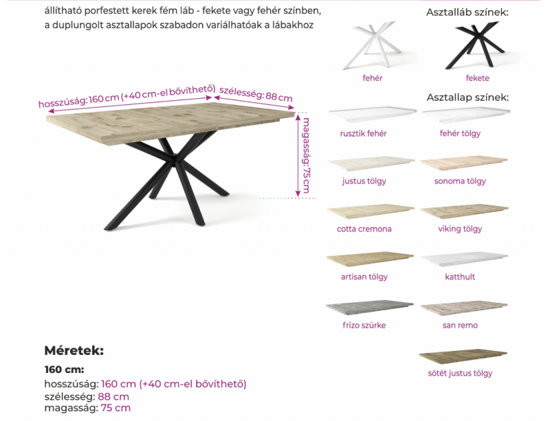 Az állítható, kerek porfestett fém láb szabadon variálható az asztallap színekkel. Az asztallap 11 féle színben, a láb fekete vagy fehér színben érhető el.