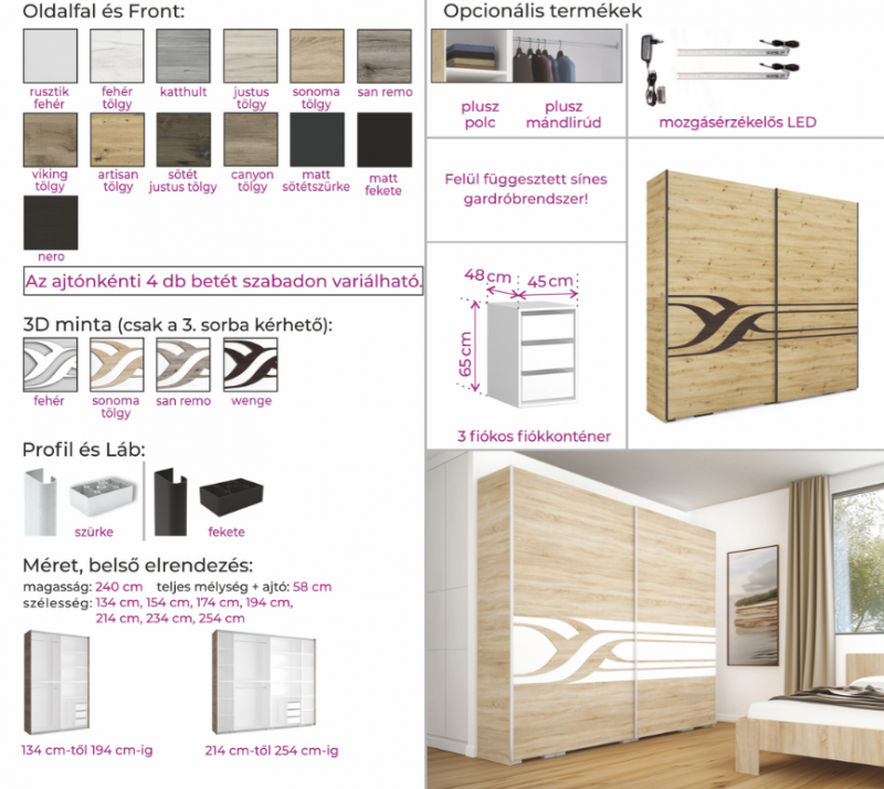 Elegáns külső, praktikus belső elrendezés! A gardrób ajtói 4-4 panelből állnak, melyek színei szabadon választhatóak. Mind a panelek, mind az oldalfal 13-féle színben kérhető, így a legkülönfélébb színvariációk állíthatóak össze. Gardróbunk különlegessége a front 3. sorára kerülő 3D minta, amely 4 színben érhető el. Ezen felül lehetőség van szürke vagy fekete profillal/lábbal kérni a terméket. A 240 cm-es magasságnak és a 7-féle szélességnek köszönhetően remek választás a kisebb szobával rendelkezőknek és a nagy tárolóhelyre vágyók számára egyaránt. A gardrób remek választás, ha teljesen személyre szeretnénk szabni gardróbunk megjelenését és belső elrendezését.