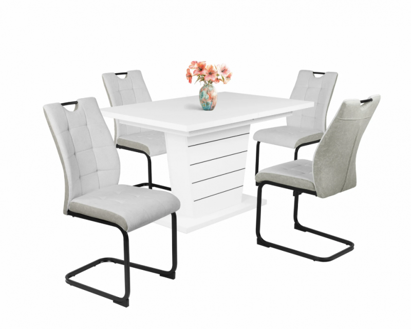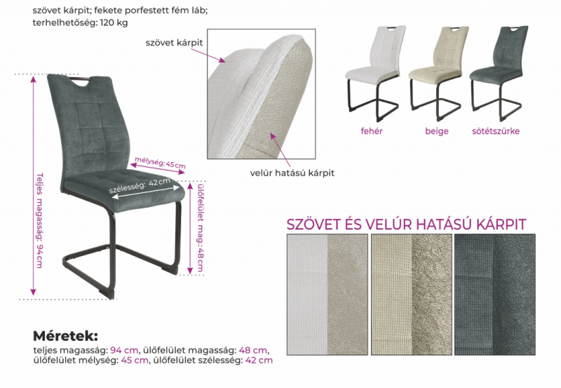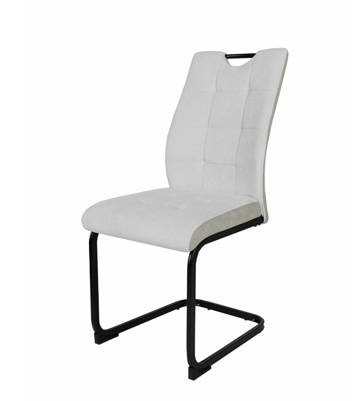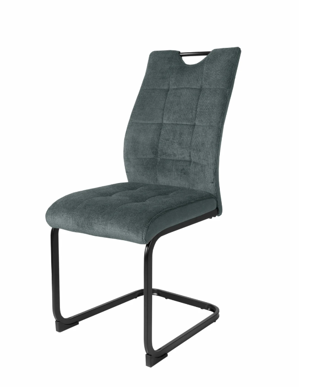 Ez a szék szánkótalpas kivitelben készül a modern otthonok számára. Szövet ülőfelület és háttámla, hátoldalán velúr hatású kárpittal, fekete porfestett fém láb.