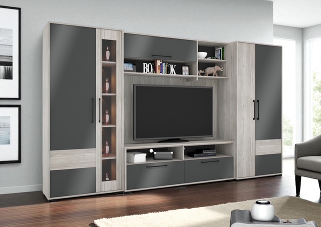 Modern forma és színvilág. Ez a szekrénysorunk katthult és magasfényű antracit színkombinációban kapható. Üveges elemébe opcionálisan LED világítás is rendelhető. Polcos és akasztós elemei további polcokkal egészíthetőek ki.